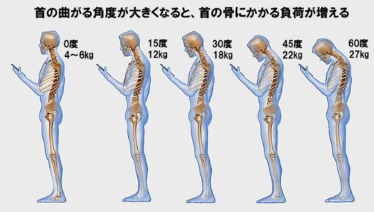 近年は「スマホ症候群」等と言われる首の症状を訴える患者さんが急増中。首の角度の違いで負担の大きさが全く異なります。約5㎏の頭の位置が変われば、支える首周囲の小さな筋肉もかなりの負担が生じますので、長時間の使用はご注意下さい。