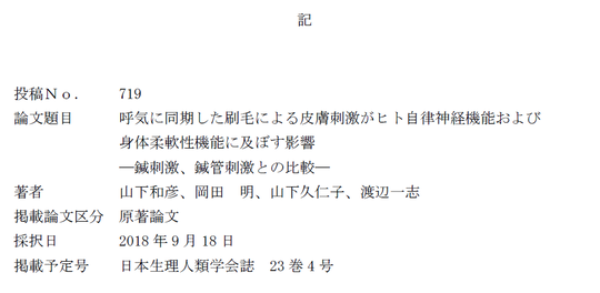 刷毛刺激は、「皮膚・皮下組織刺激、呼気時、座位」の刺激と同等に自律神経反応に影響を及ぼし、身体柔軟性機能が向上することを報告した。