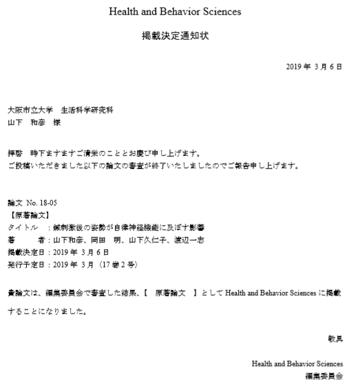 日本生理人類学会誌 原著論文原稿の採用決定