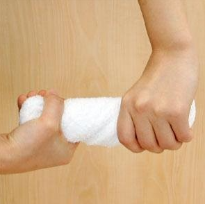ちょっとした動きで腰に激痛が走り、その瞬間から身体が微動だに動かせない病態です。下図にタオルを絞った絵がありますが、その下にはタオルがシワシワの状態になっています。これが「ぎっくり腰」になっている腰周囲の筋の状態といわれています。