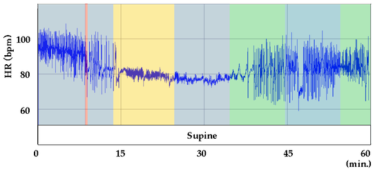 この記録を見ると、手技を始めた直後に心拍変動(HRV)が小さくなり、瞬時心拍数が低下していることが分かります。