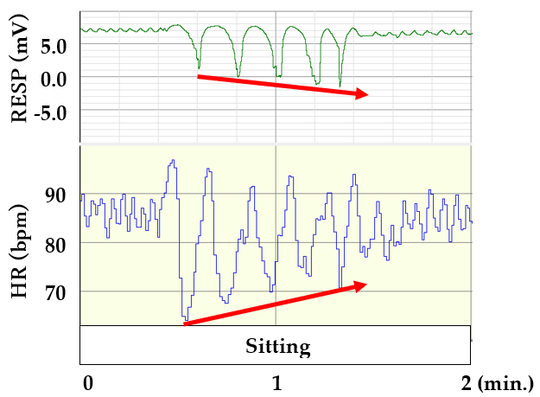 息を吐く(緑ラインが低下)すると心拍数が減少