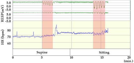 正常なRSA(呼吸性洞性不整脈)は吸気で心拍数は上昇し、呼気で下降する。
