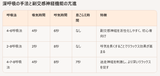 深呼吸の方法は個人の状態に応じて選ぶことが重要です。特に迷走神経の活性化を目的とする場合、呼気を長くする方法が有効とされています。また、正しい深呼吸の習慣を身につけることで、自律神経のバランスを整え、ストレス軽減や健康維持に役立ちます。これから、他の手法についてもご紹介していきます。